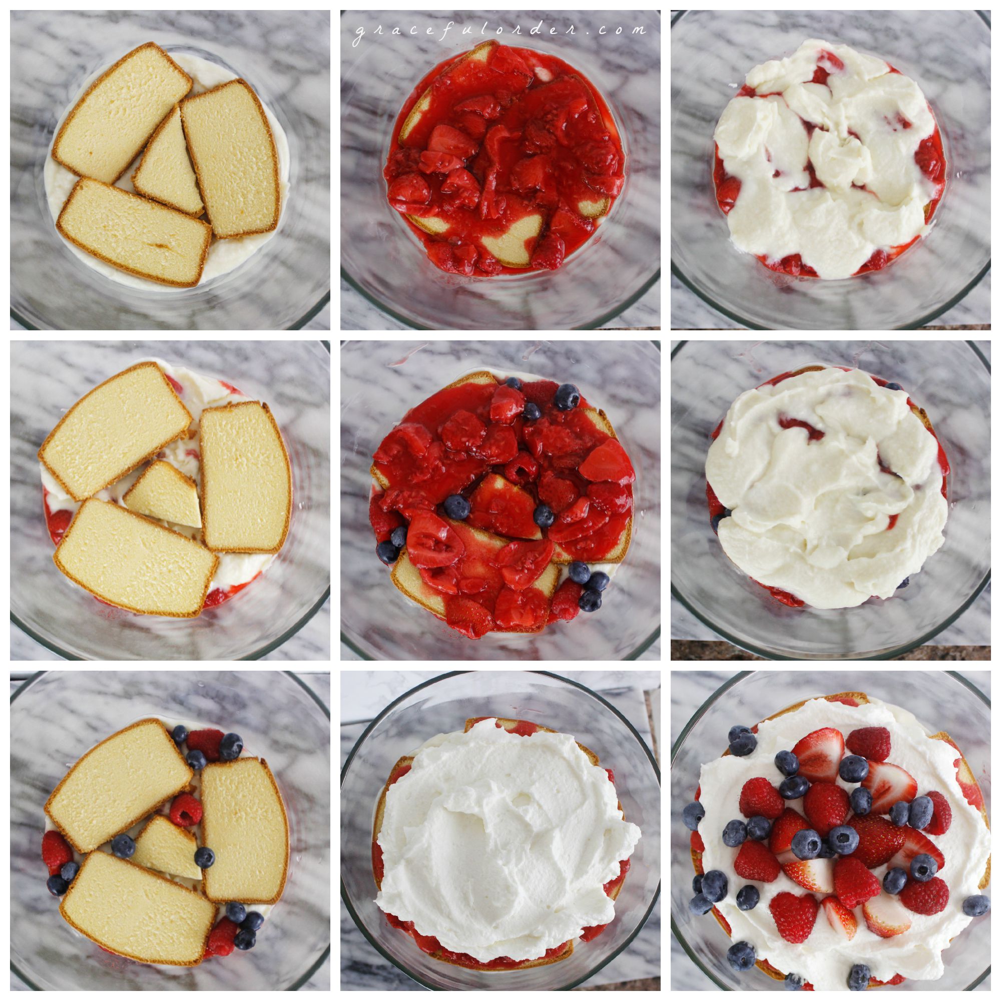 Place a small layer of whipped topping on the bottom of a trifle dish or clear vessel, then top with a layer of the pound cake. Follow with a layer of the berry sauce and top with whipped filling. Again pound cake, berry sauce, whipped filling. As you build the trifle look at the outside of the bowl to make sure that all the layers are somewhat showing. That’s what makes a trifle so pretty after all. You can also start to sprinkle in some of the fresh blueberries within the layers, always reserving some for the final topping.